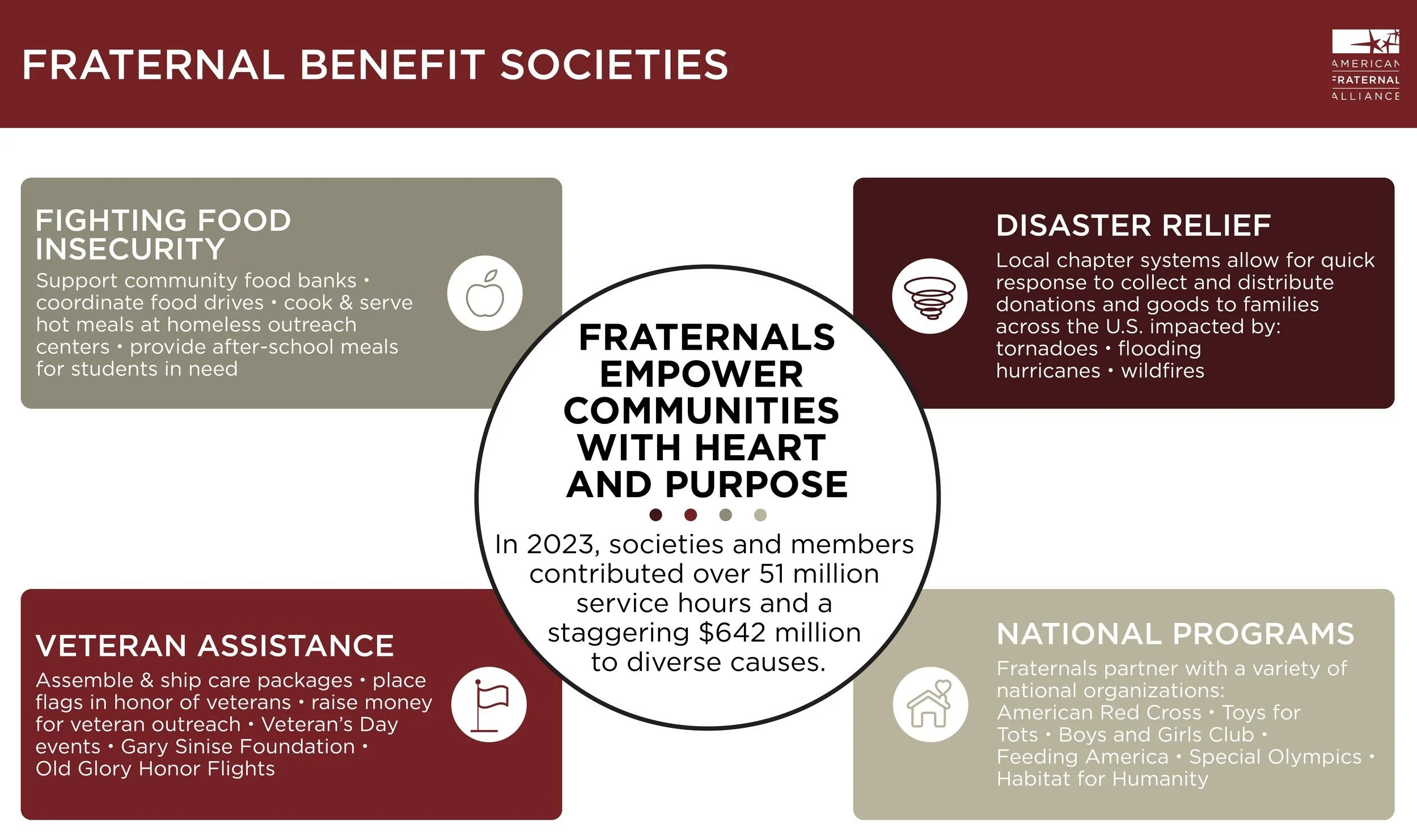 Each year, fraternal benefit societies and their 7.3 million members commit their time and resources to serve communities across the nation. Hear their stories of impact by clicking the videos below.